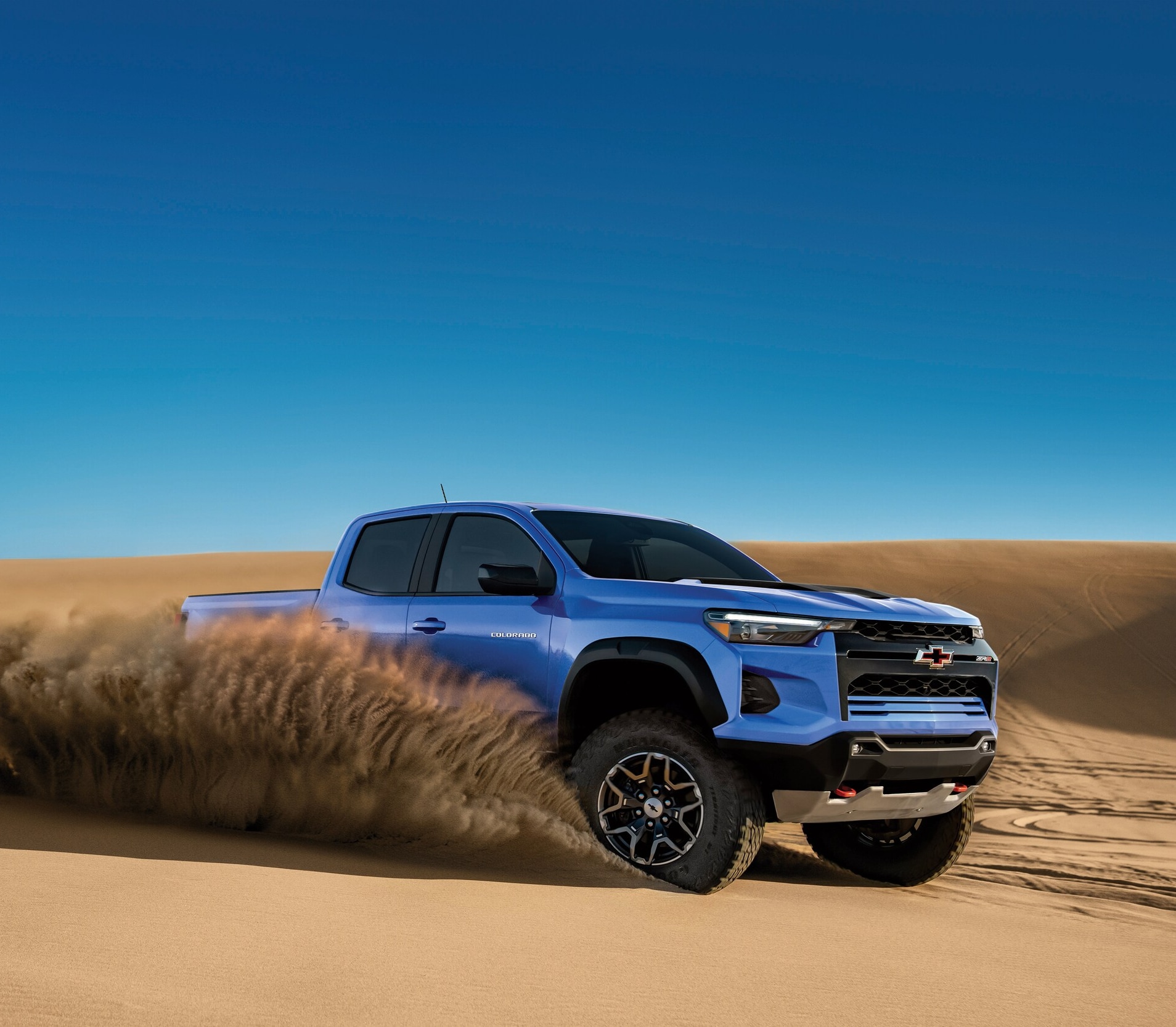 Inside the cabin, you'll find comfortable seating for up to five, with durable cloth upholstery or available leather appointments for a touch of luxury. Convenience features like dual-zone automatic climate control and heated front seats ensure a pleasant ride on chilly mornings in Grand Blanc, MI.The Colorado turns heads with its rugged yet refined design. The bold front grille, muscular lines, and standard 17-inch wheels give this midsize truck a commanding presence on the road. For an even sportier look, the Trail Boss and ZR2 trims feature distinct styling elements, including black badging and off-road-ready features.