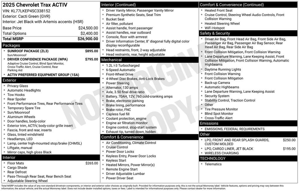 Cacti Green 2025 Chevrolet Trax ACTIV FWD 6-Speed Automatic 1.2L Ecotec Turbo DOHC DI w/VVTRecent Arrival! 28/32 City/Highway MPGAwards:* Car and Driver 10 BestCar and Driver, January 2017.