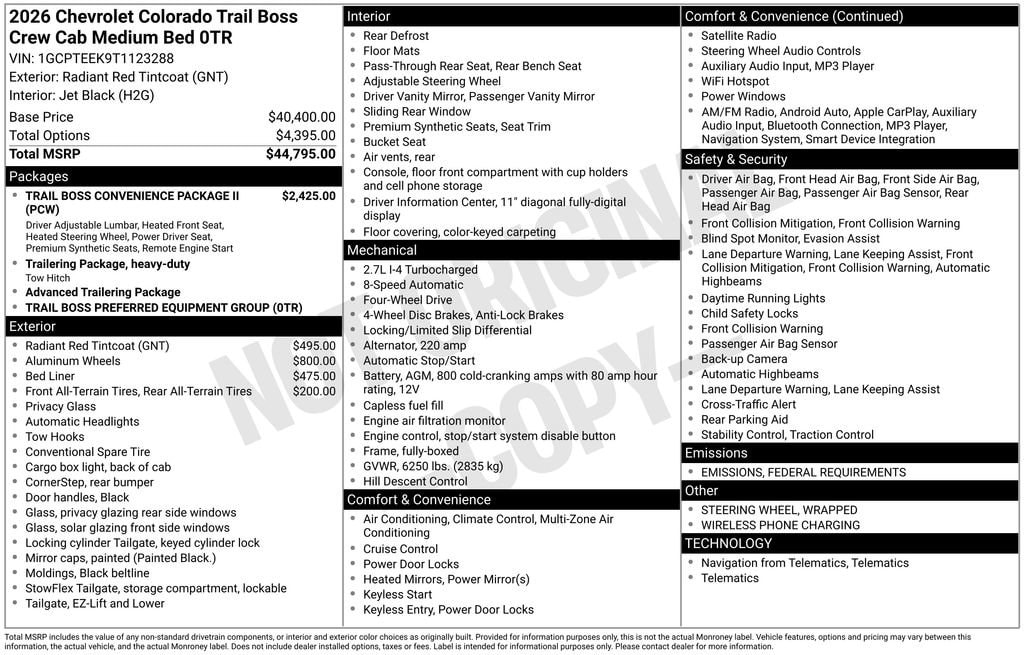 Radiant Red Tintcoat 2026 Chevrolet Colorado Trail Boss 4WD 8-Speed Automatic 2.7L I4 Turbocharged DOHC 16V LEV3-ULEV50 310hp 4WD.