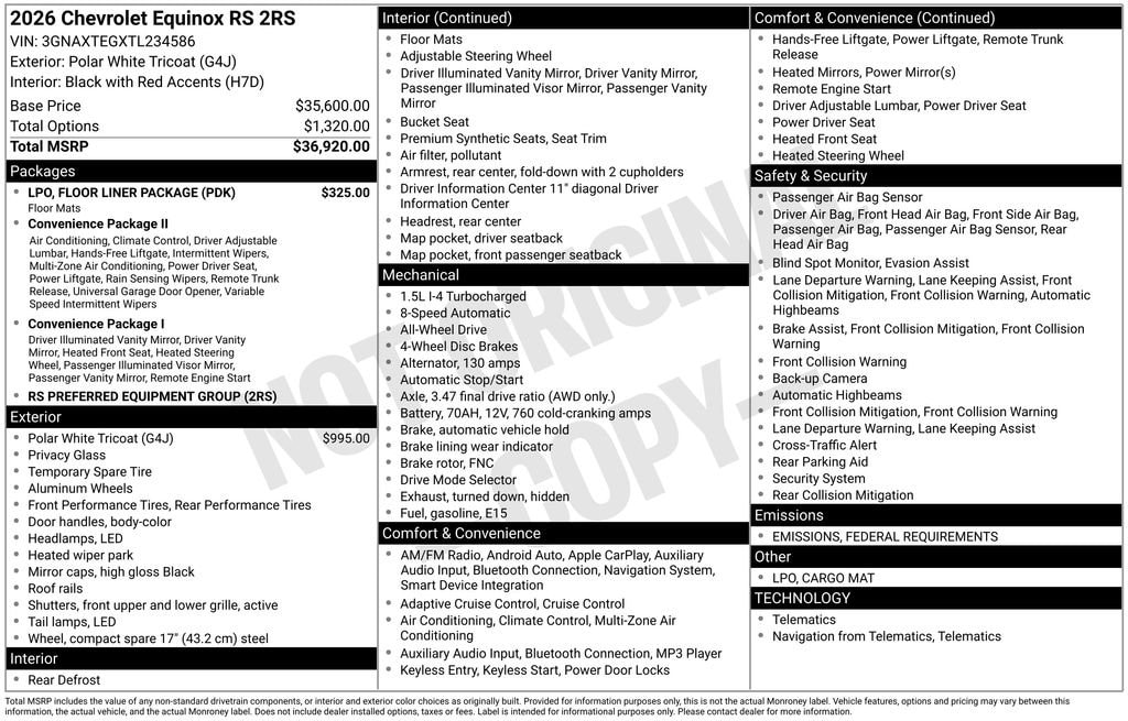 Polar White Tricoat 2026 Chevrolet Equinox RS AWD 8-Speed Automatic 1.5L DOHC AWD.