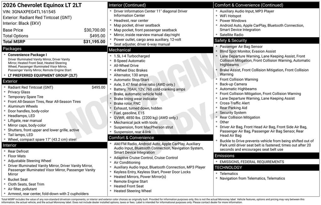Radiant Red Tintcoat 2026 Chevrolet Equinox LT AWD 8-Speed Automatic 1.5L DOHC AWD.