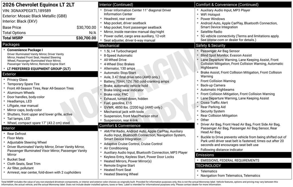 Mosaic Black Metallic 2026 Chevrolet Equinox LT AWD 8-Speed Automatic 1.5L DOHC AWD.