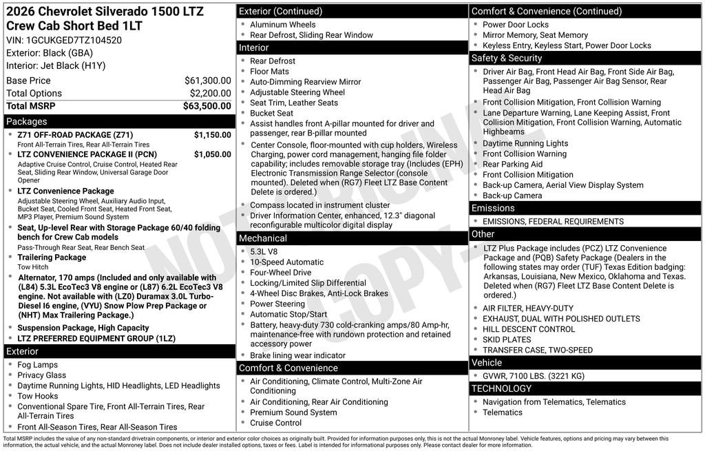 Black 2026 Chevrolet Silverado 1500 LTZ 4WD 10-Speed Automatic EcoTec3 5.3L V8 10-Speed Automatic, 4WD, Black Leather.