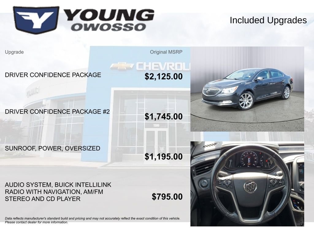LOCAL TRADE!, LaCrosse Premium I Group, 3.6L V6 E85 Flex Fuel SIDI DOHC VVT, 4-Way Power Driver Lumbar Seat Adjuster, 8-Way Power Driver Seat Adjuster, 8-Way Power Front Passenger Seat Adjuster, Adaptive Cruise Control, Articulating Headlamps, Automatic Collision Preparation, Bose Centerpoint Premium 11-Speaker Surround Sound, Driver Confidence Package # 1, Driver Confidence Package # 2, Forward Collision Alert, Front dual zone A/C, Front Halogen Fog Lamps, Head-Up Display, Heated & Ventilated Front Bucket Seats, Heated steering wheel, Lane Departure Warning System, Oversized Power Sunroof, Perforated Leather-Appointed Seat Trim, Premium 1 1SP, Rear Cross-Traffic Alert, Side Blind Zone Alert w/Lane Change Alert, Xenon High Intensity Discharge Projector Headlamps.