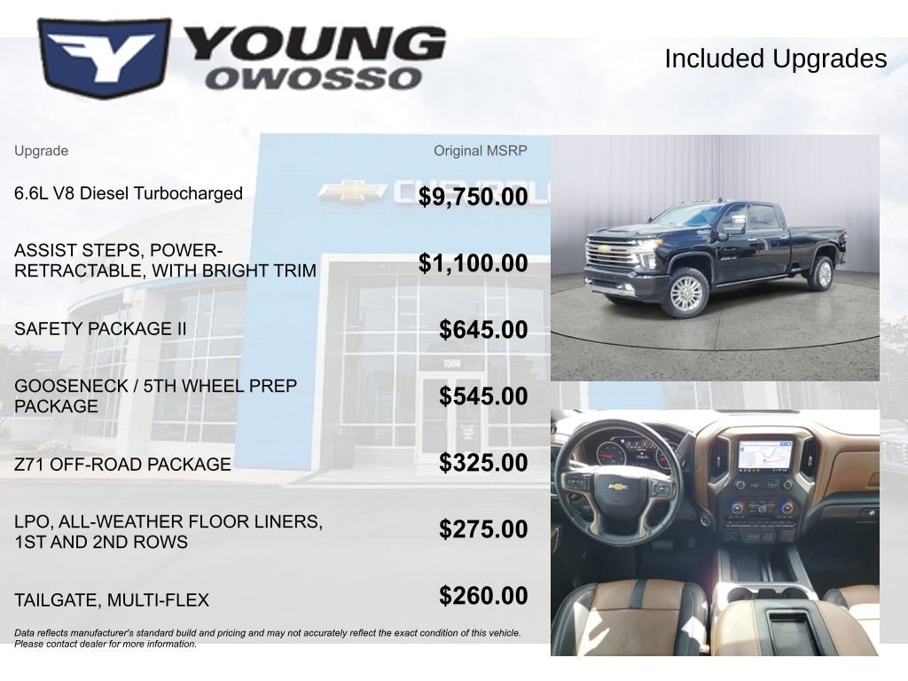 LOCAL TRADE!, NEW TIRES!, CARFAX ONE OWNER!, CLEAN CARFAX!, Silverado 3500HD High Country, Duramax 6.6L V8 Turbodiesel, 10-Speed Automatic, 4WD, Jet Black/Umber Leather, 12-Volt Rear Auxiliary Power Outlet, 120-Volt Bed Mounted Power Outlet, 120-Volt Instrument Panel Power Outlet, 170 Amp Alternator, 220 Amp Alternator, 2nd Row Dual USB Charge-Only Ports, 6 Rectangular Chromed Tubular Assist Steps, 8 Driver Information Center, Advanced Trailering System, Auto-Dimming Inside Rear-View Mirror, Automatic Emergency Braking, Bed View Camera w/2 Trailer Camera Provisions, Bluetooth® For Phone, Chevrolet Connected Access Capable, Chevytec Spray-On Black Bedliner w/Chevrolet Logo, Chrome Front Grille Bar w/Chrome Grille Inserts, Chrome Mirror Caps, Color-Keyed Carpeting Floor Covering, Compass Located In Instrument Cluster, Deep-Tinted Glass, Electric Rear-Window Defogger, Electrical Lock Control Steering Column, Following Distance Indicator, Forward Collision Alert, Front Carpeted Floor Mats, Front Chrome Recovery Hooks, Front LED Fog Lamps, Gooseneck/5th Wheel Prep Package, HD Surround Vision w/2 Trailer View Camera Provisions, Heated Steering Wheel, Hitch Guidance w/Hitch View, Integrated Trailer Brake Controller, IntelliBeam Automatic High Beam On/Off, Keyless Open & Start, Lane Change Alert w/Side Blind Zone Alert, Lane Departure Warning System, Leather-Wrapped Steering Wheel, LED Cargo Area Lighting, Manual Tilt/Telescoping Steering Column, OnStar & Chevrolet Connected Services Capable, Polished Exhaust Tip, Power Door Locks, Power Front Passenger Windows w/Express Up/Down, Power Front Windows w/Driver Express Up/Down, Power Rear Windows w/Express Down, Power Sliding Rear Window w/Defogger, Power-Adjustable Outside Mirrors, Preferred Equipment Group 3LZ, Rear Carpeted Floor Mats, Rear Cross Traffic Alert, Remote Vehicle Starter System, Safety Alert Seat, Safety Package II, SiriusXM w/360L, Snow Plow Prep/Camper Package, Standard Tailgate, Steering Wheel Audio Controls, Steering Wheel Mounted Electronic Cruise Control, Suspension Package, Unauthorized Entry Theft-Deterrent System, Universal Home Remote, Up-Level Rear Seat w/Storage Package, Wi-Fi Hotspot Capable, Wireless Charging, Wireless Phone Projection.