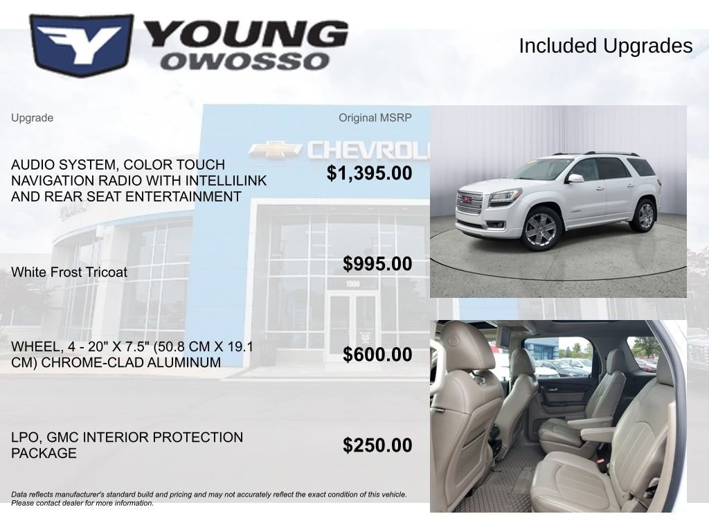 LOCAL TRADE!, 3RD-ROW SEATING!, Wholesale to the Public, Acadia Denali, 3.6L V6 SIDI, FWD, Cocoa Dune Leather, 1st & 2nd Row All-Weather Floor Mats, 2-Position Memory For Driver's Seat Adjuster, 3rd Row All-Weather Floor Mats, 8-Way Power Driver Seat w/Memory, 8-Way Power Passenger Seat Adjuster, Body-Color Moldings w/Chrome Insert, Bose Premium 10-Speaker Audio System, Denali Specific Acoustic Insulation Package, Denali Specific Body-Color Rocker Molding, Denali Specific Bright Side Rails Luggage Rack, Denali Specific Dual Flow Through Fascia Exhaust, Denali Specific Front Fascia, Denali Specific Illuminated Sill Plate, Dual SkyScape 2-Panel Power Sunroof, Forward Collision Alert & Lane Departure Warning, GMC Interior Protection Package (LPO), Head-Up Display, Heated & Cooled Front Seats, Heated Leather Wrapped Steering Wheel, Heated Power-Adjustable Outside Mirrors, Heavy-Duty Cooling System, High-Intensity Discharge Projector Low Beam Headlamps, Inside Rear-View Auto-Dimming Mirror, Leather-Wrapped Steering Wheel w/Wood Trim, Power Rear Liftgate Body, Power Tilt & Telescopic Steering Column, Power Windows w/Driver Express-Up & -Down, Preferred Equipment Group 5SA, Premium Carpeted Front 2nd & 3rd Row Floor Mats, Rear All-Weather Cargo Mat (LPO), Rear Audio System Controls, Rear Cargo Area Audio System Controls, Remote Vehicle Start, Side Blind Zone Alert & Rear Cross Traffic Alert, Steering Wheel Mounted Audio Controls, Technology Package, Trailer Hitch, Trailering Equipment, Tri-Zone Automatic Climate Control, Universal Home Remote, Variable Effort Power Steering.