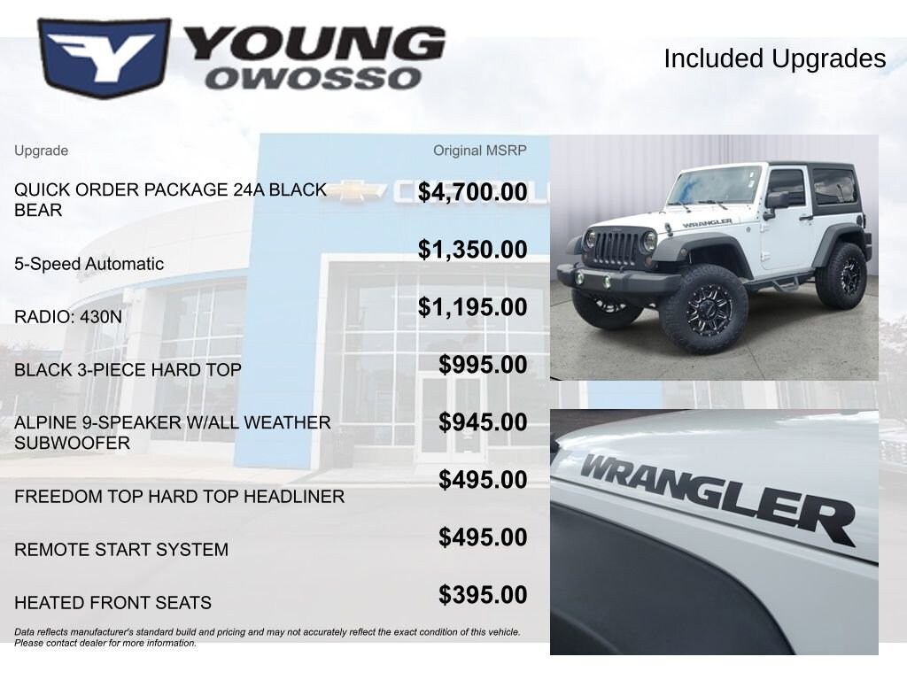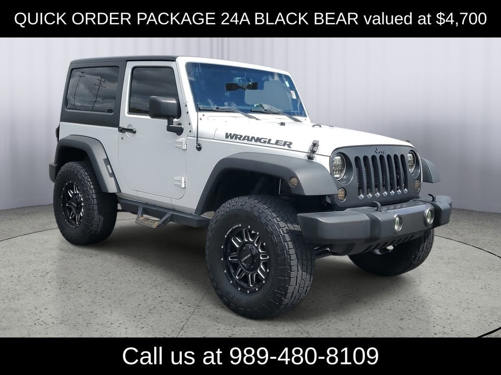 LOCAL TRADE!, Wrangler Black Bear, 3.6L V6 24V VVT, 4WD, Air Conditioning, Auto-Dimming Mirror w/Reading Lamp, Black Bear Package, Black Cloth Seats w/Sport Mesh (DISC), Black/Chrome Screws Fuel Filler Door, Connectivity Group, Deep Tint Sunscreen Windows, Driver Height Adjuster Seat, Front 1-Touch Down Power Windows, Front Seat Back Map Pockets, Granite Crystal Jeep Badge, Iron Gray Interior Accents, Low Gloss Black Grille, Mid Gloss Granite Crystal Appliques, MOPAR Black Tail Lamp Guards, MOPAR Slush Mats, Power Convenience Group, Power Heated Mirrors, Power Locks, Premium Black Sunrider Soft Top, Quick Order Package 24A Black Bear (DISC), Remote Keyless Entry, Remote USB Port, Security Alarm, Sunrider Soft Top, Tire Pressure Monitoring Display, Uconnect Voice Command w/Bluetooth, Vehicle Information Center, Wheels: 17 x 7.5 Blk Semi-Gloss Aluminum (DISC), Wrangler Hood Decal Low Gloss Black.Awards:* 2016 KBB.com 10 Best SUVs Under $25,000 * 2016 KBB.com Best Resale Value Awards * 2016 KBB.com 10 Most Awarded Cars * 2016 KBB.com 10 Most Fun SUVs * 2016 KBB.com 10 Coolest New Cars Under $25,000